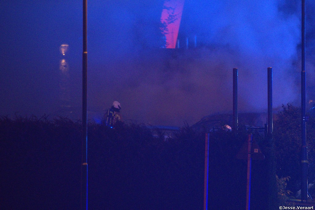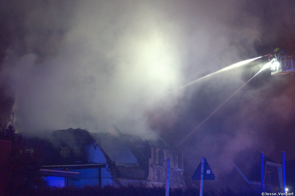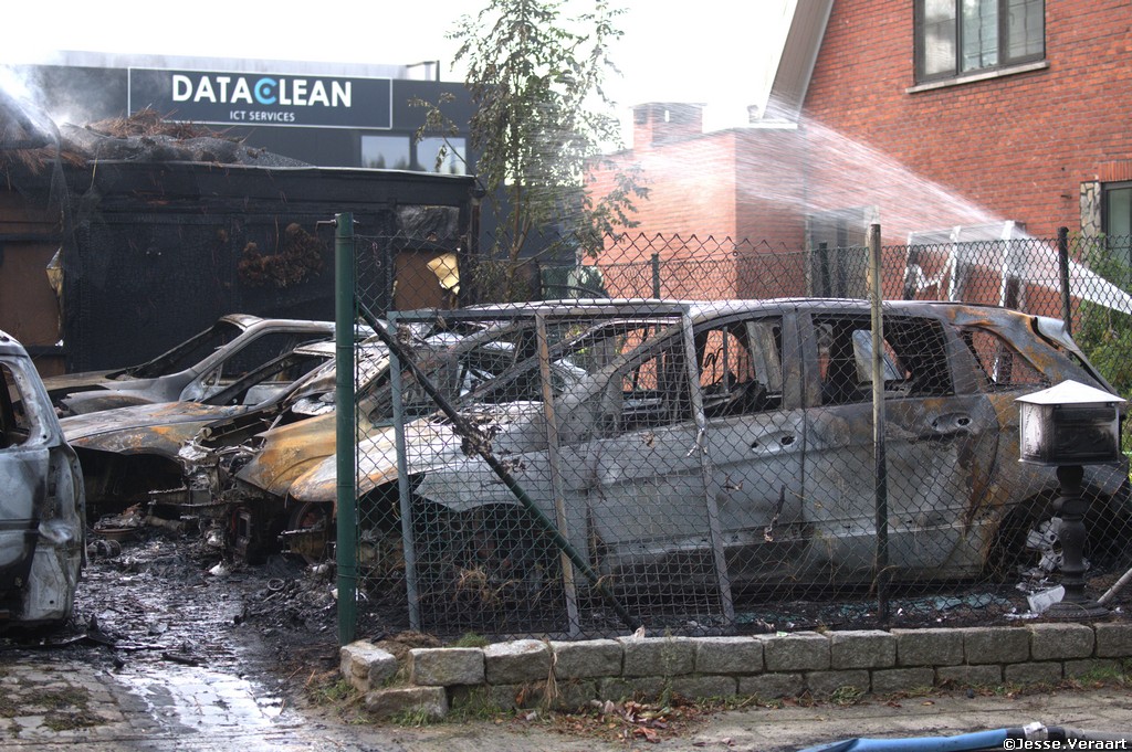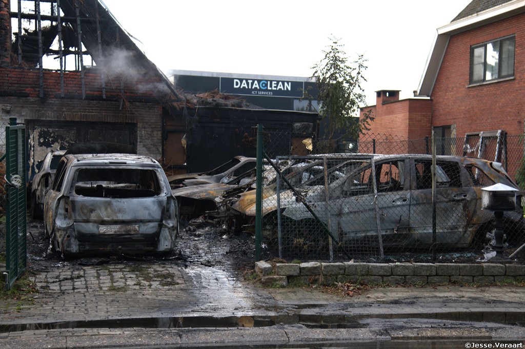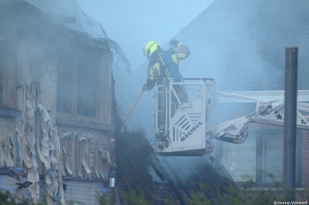 Bij aankomst van de brandweer zone Rand stonden zowel de villa met een rieten dak als ook 12 voertuigen die voor de woning stonden volledig in lichterlaaie.
